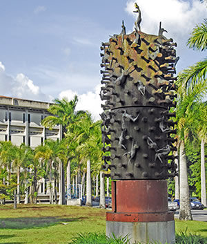 Esta escultura de tres metros de alto por metro y medio de diámetro con un movimiento giratorio y contrapuesto en los cilindros que la componen, y donde sobre puntos que salientes se ubican cincuenta pequeñas figuras, es obra del artista venezolano Carlos Prada, quién la donó en 1972.